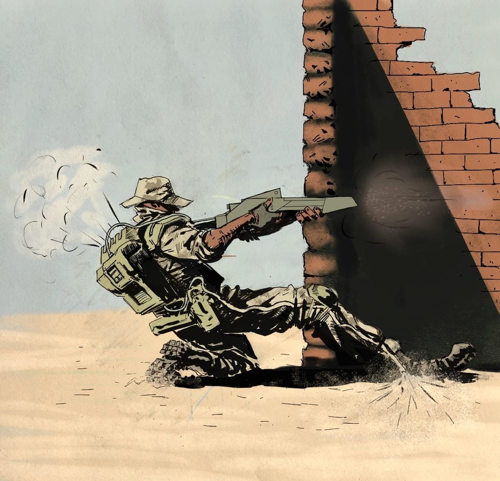 A backpack filters the incoming objects, with a screen for adapting the settings for different types of conditions and materials, such as sand or ice. The weapon is attached to a shoulder armor and can be rotated and attached to the backpack.